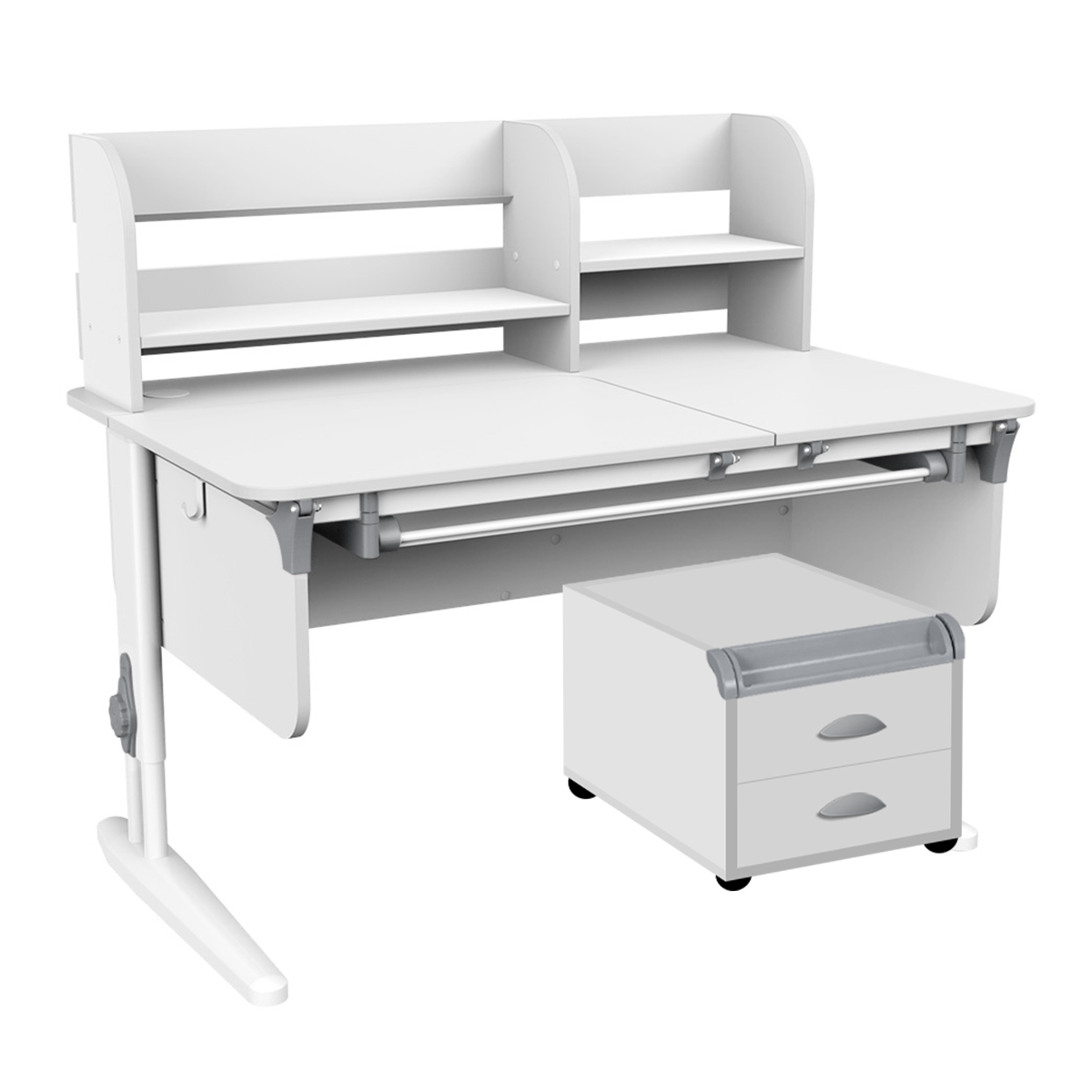 Раздельная парта Дэми СУТ.62 PRO с выдвижным пеналом, надстройкой и тумбой белый/серый/белый с тумбой ТУВ-09 белый/серый